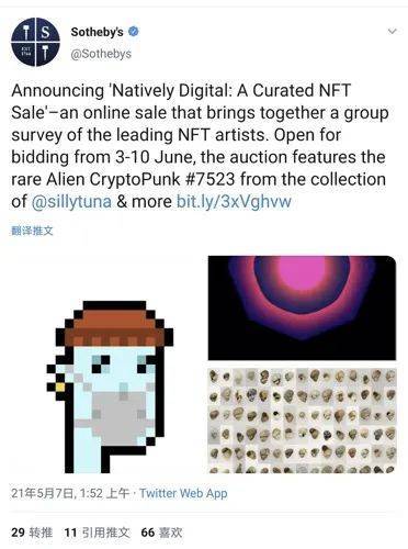 5月7日,世界顶级拍卖行苏富比宣布,将于6月3日至6月10日举办NFT艺术展暨“国家数码”拍卖会。
