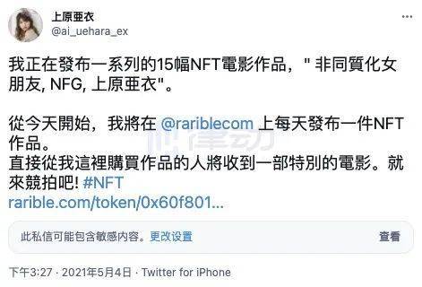 日本著名女星上原雅彦在微博上透露,将在NFT交易平台Rabble上拍卖15部NFT收藏的“非同质女友”系列,最终买家还将获得一部特别影片。