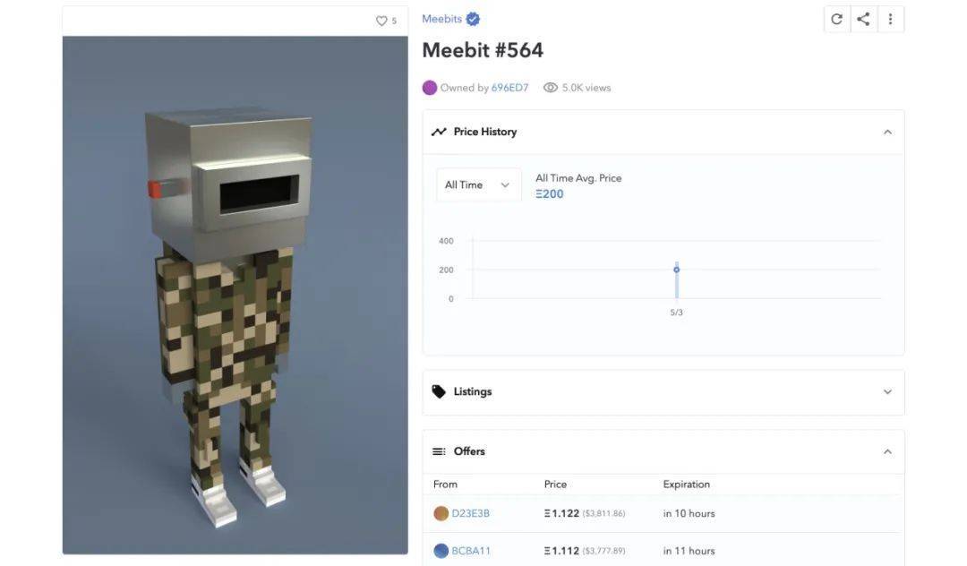 meebits是cryptopunks开发团队幼虫实验室的第三个NFT艺术项目,已经开始销售,单个NFT的售价为200ETH。根据幼虫实验室的官方信息,meebits包括2万个根据特定算法自动生成的3D NFT,其中9000个通过公募发售,其余NFT将以空投的形式发送给加密朋克和autoglyphs用户。其中,meebits No.564 NFT在OpenSea的售价为200 ETH,约为66万美元。